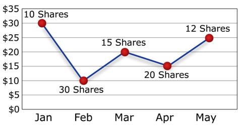 The accompanying graph illustrates how share price fluctuations can yield a lower average cost per share through dollar-cost averaging. In this hypothetical example, ABC Company's stock price is $30 a share in January, $10 a share in February, $20 a share in March, $15 a share in April, and $25 a share in May. If you invest $300 a month for 5 months, the number of shares you would buy each month would range from 10 shares when the price is at $30, to 30 shares when the price is $10. The average market price is $20 a share ($30+$10+$20+$15+$25 = $100 divided by 5 = $20). However, because your $300 bought more shares at the lower prices, the average purchase price is $17.24 ($300 x 5 months = $1,500 invested divided by 87 shares purchased = $17.24).